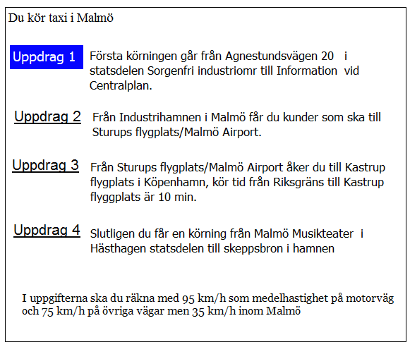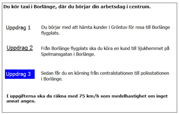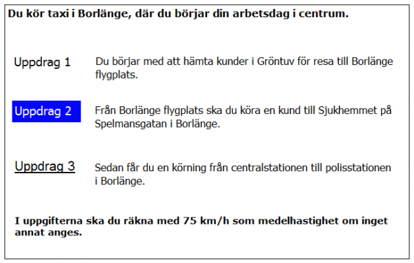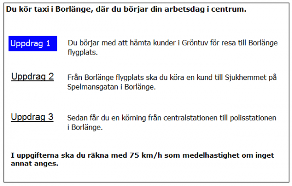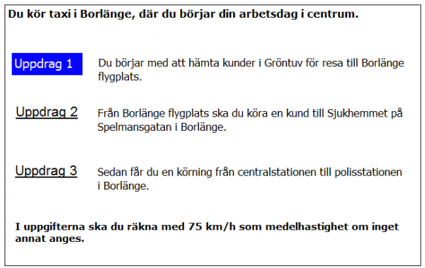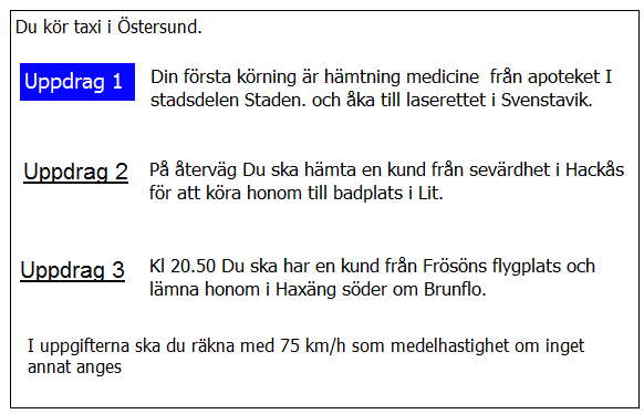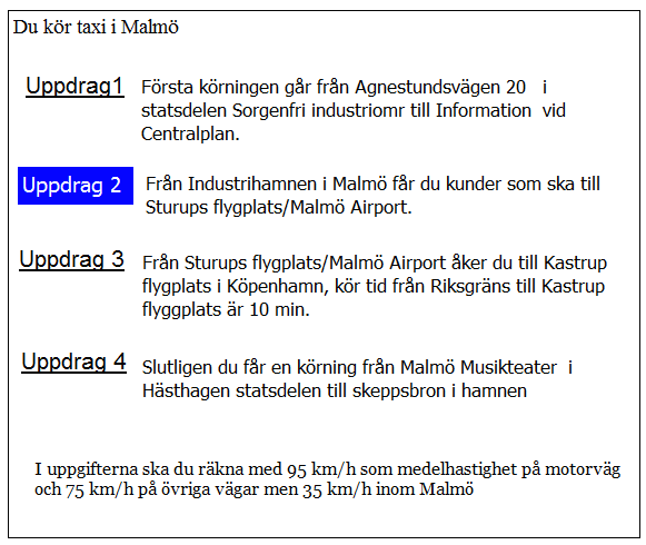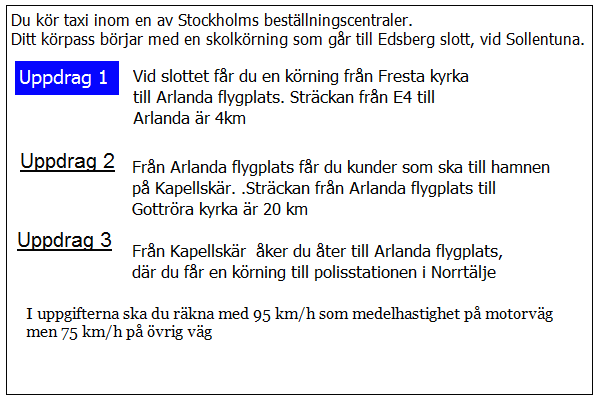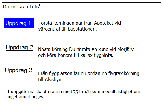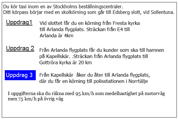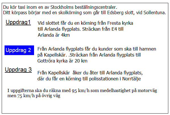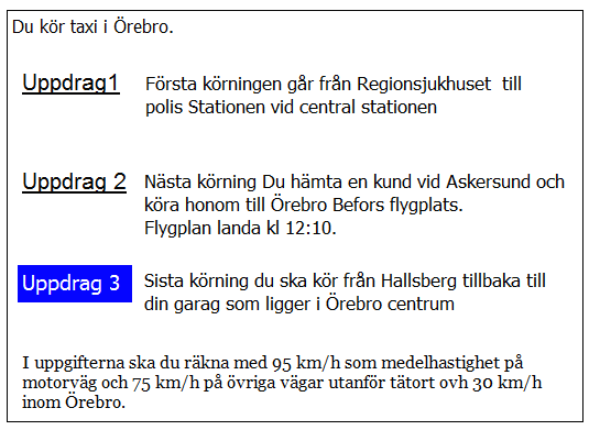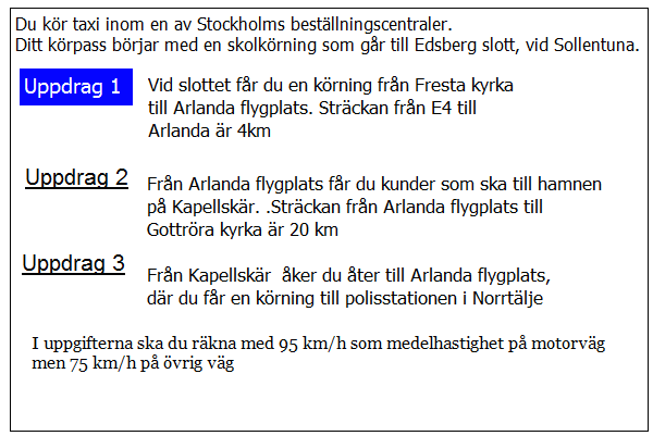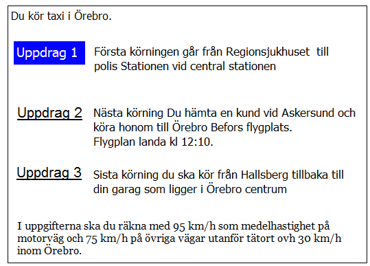 Hur lång blir kundernas restid till flygplatsen i uppdrag 1? Räkna med medelhastigheten 35 km/tim i 5 km genom Borlänge 75 km/h resten av sträckan.