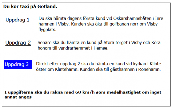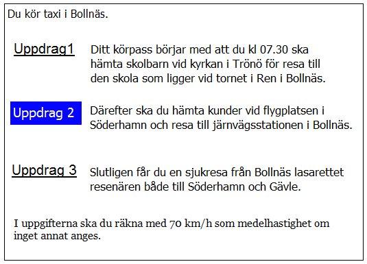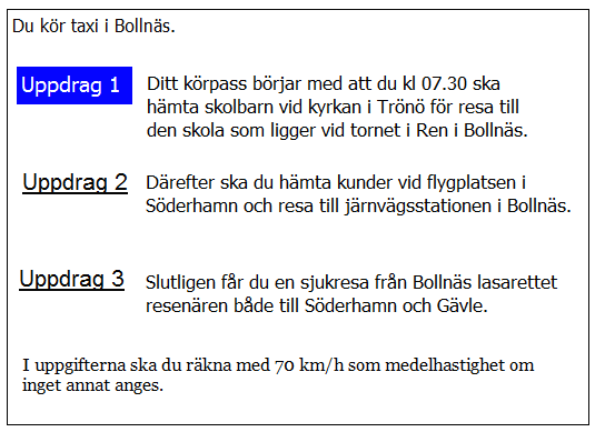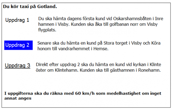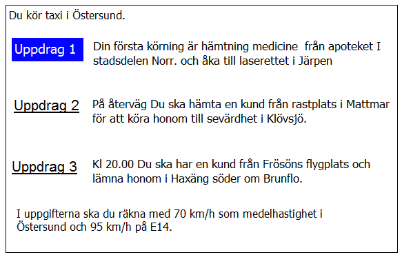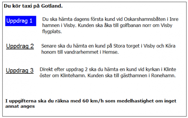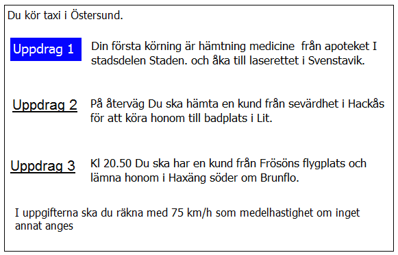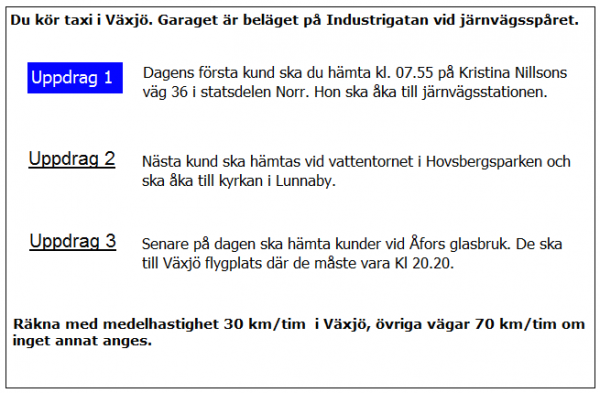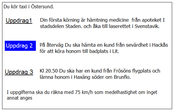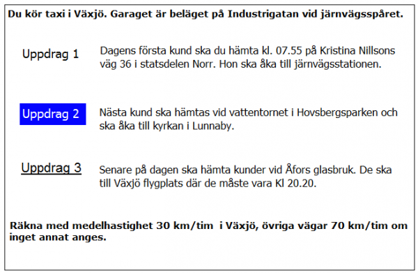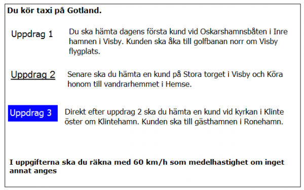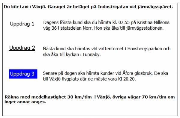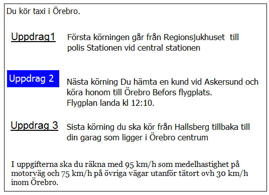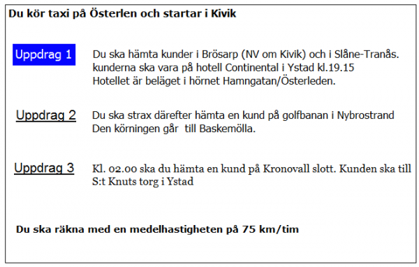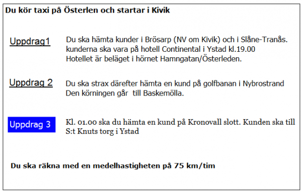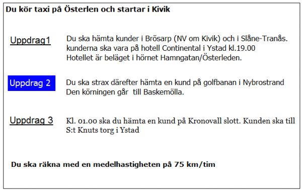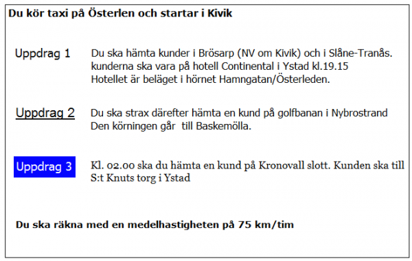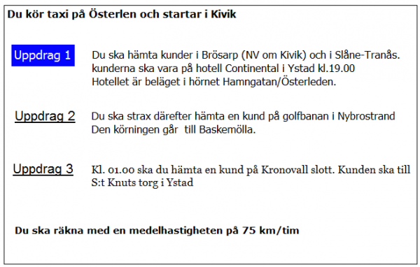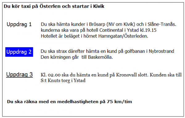Ca 10 minuter innan du ska lämna av kunden i uppdrag 2 blir du kontaktad av telefonisten som vill veta när du kan vara tillbaka i Kivik. När är du tidigast tillbaka?