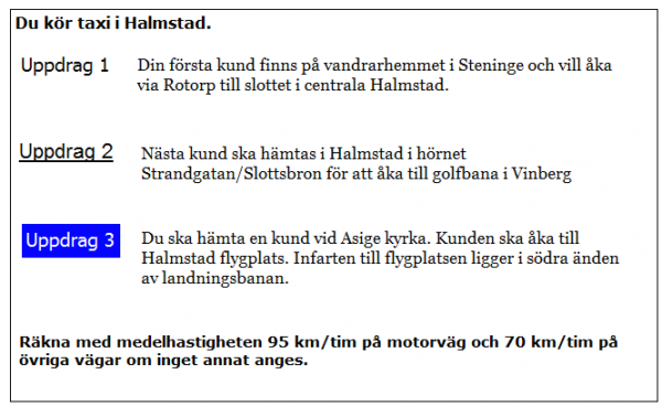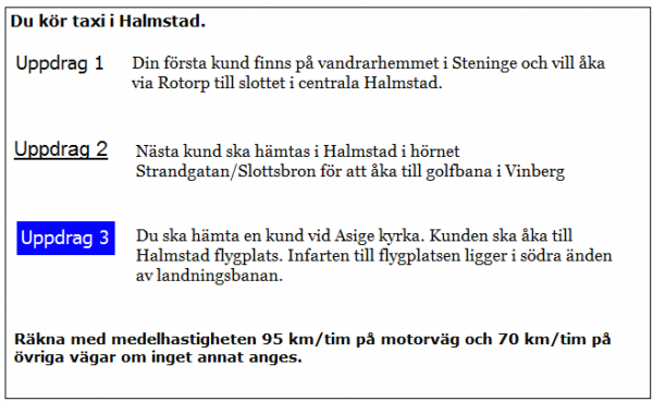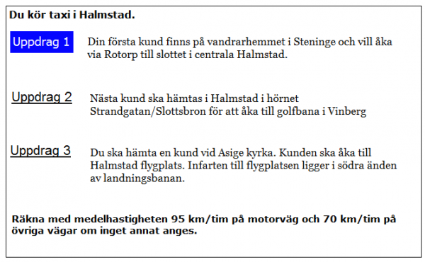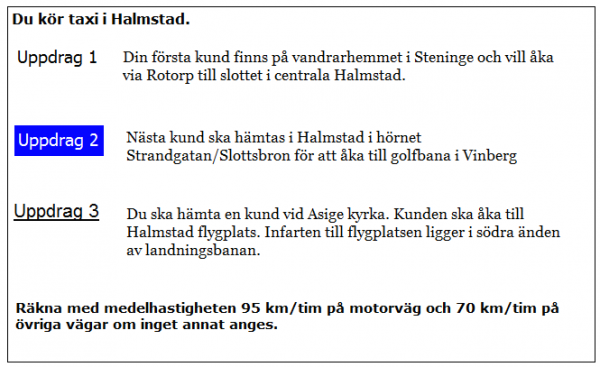 Hur långt blir kundens restid i uppdrag 2? Räkna med en medelhastighet på 35 km/tim för sträckan i Halmstad fram till påfarten till E6 vid väg 25.
