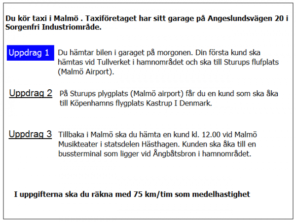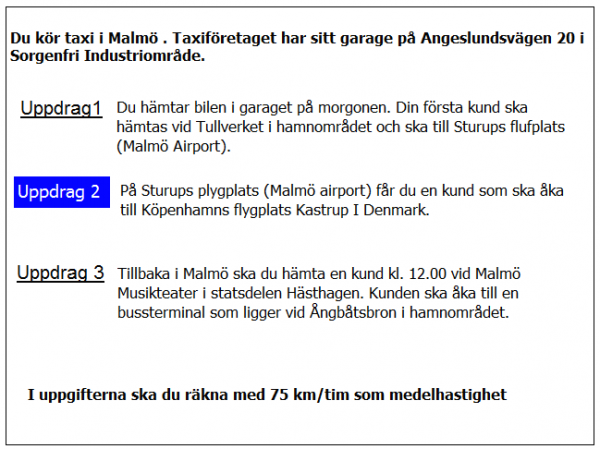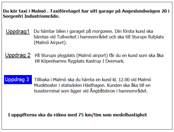 Du tankar bilen på en bensinstationen vid järnvägsstationen i Ystad. Därefter ska du hämta kunden i uppdrag 2. Hur lång blir framkörningen efter tankningen?