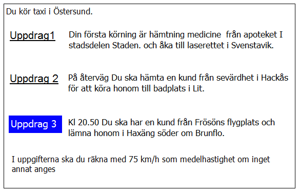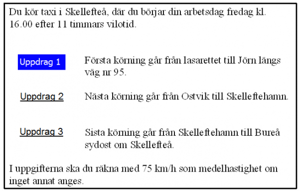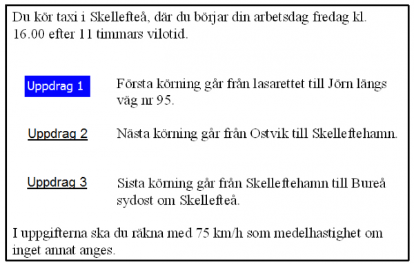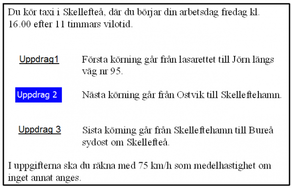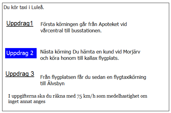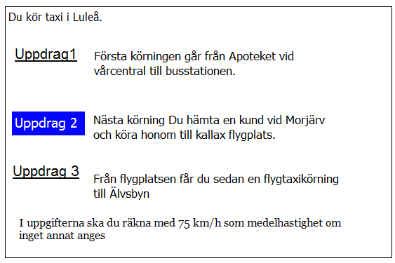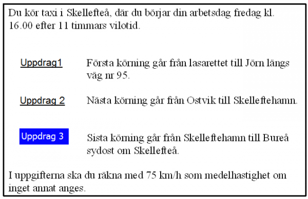 25 km från Älvsbyn i uppdrag 3 blir det halt väglag. Medelhastigheten sänks till hälften. Hur mycket längre tid tar körningenpå grund av halkan?