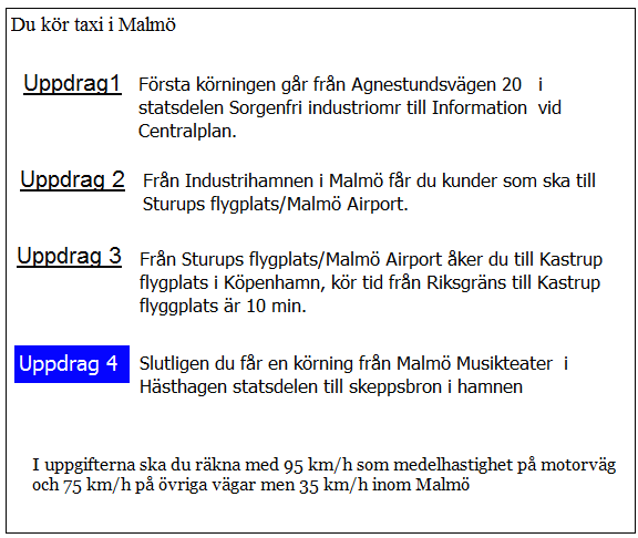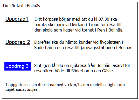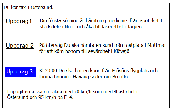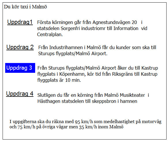 När måste du senast hämta kunderna i uppdrag 3 för att hinna till flygplatsen på utsatt tid? Räkna med medelhastigheten 70 km/tim på hela sträckan.