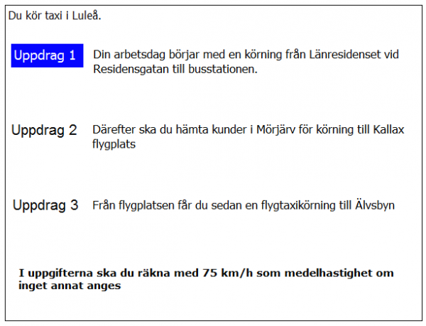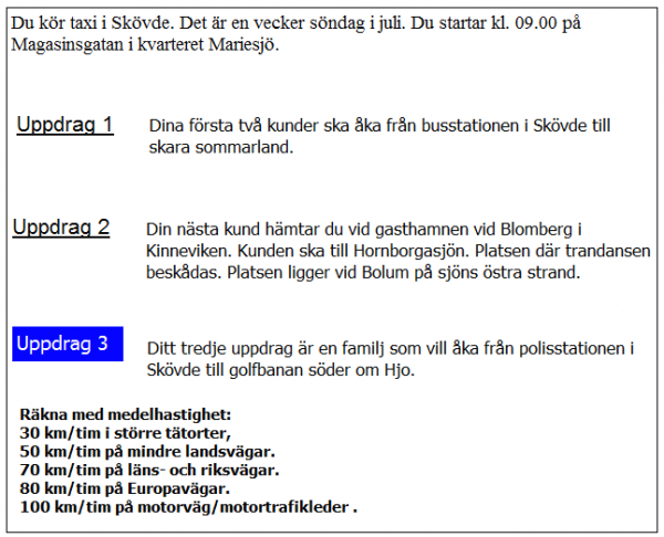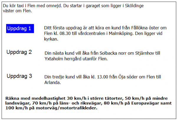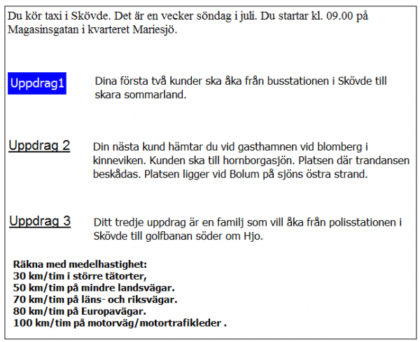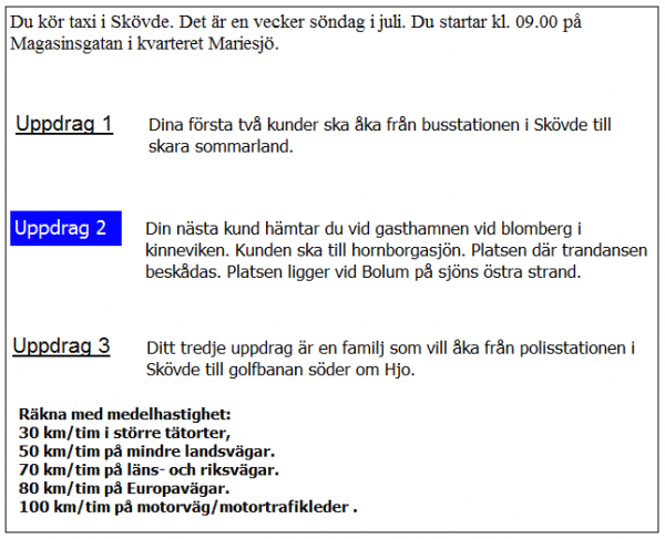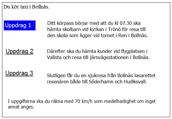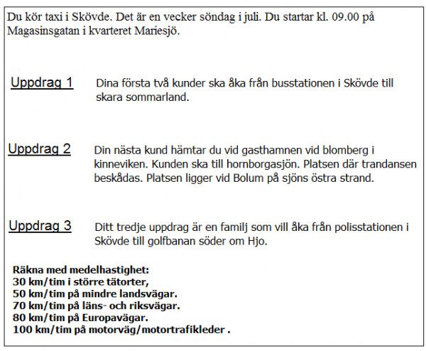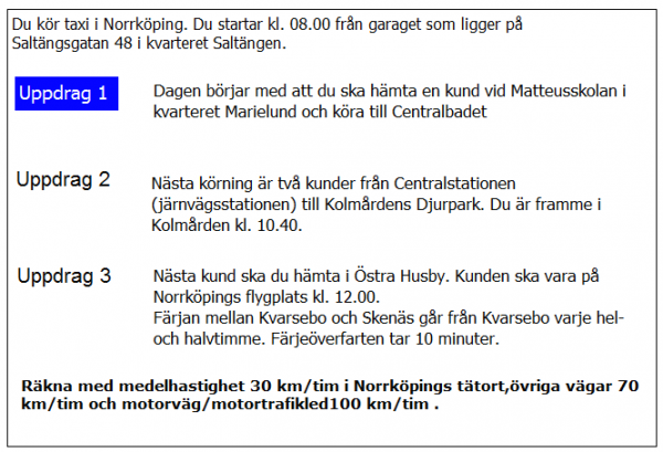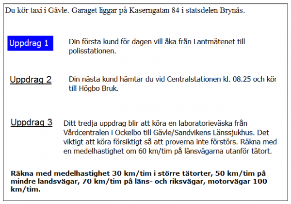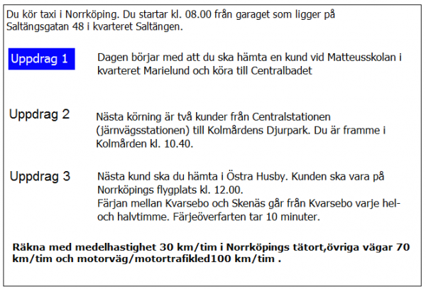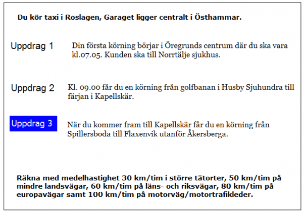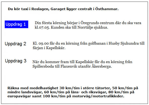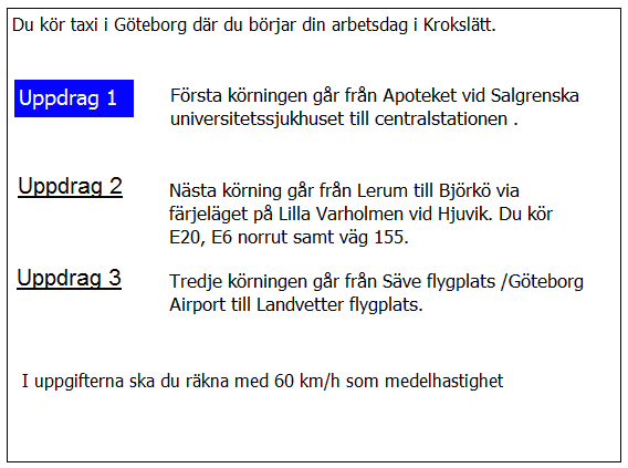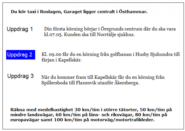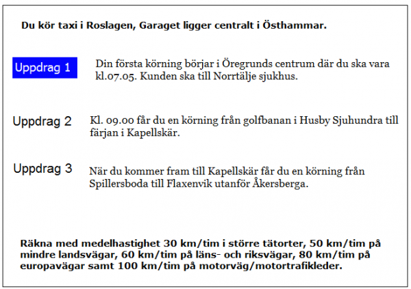 Du ska i uppdrag 1 vara vid skolan klockan 08.20. När måste du då senast starta från garaget?