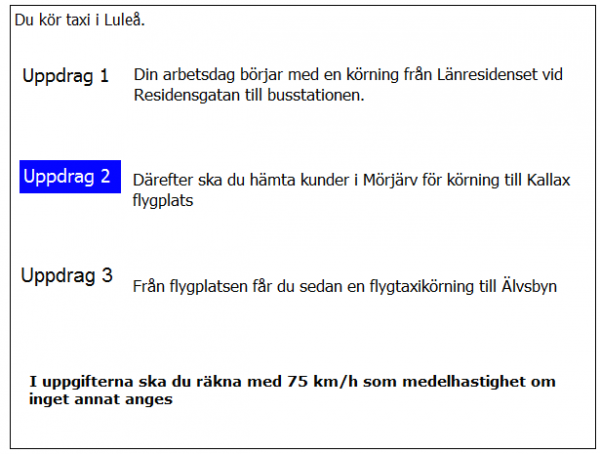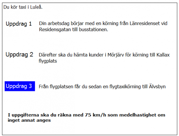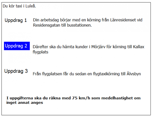 20 km från Älvsbyn i uppdrag 3 blir det halt väglag. Medelhastigheten sänks till hälften. Hur mycket längre tid tar körningen på grund av halkan?