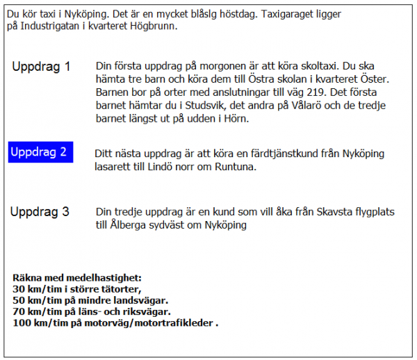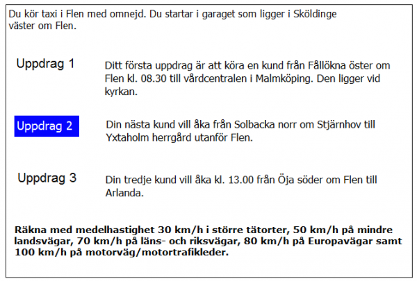 När du i uppdrag 2 kommer till Runtuna kyrka hör att träd olåst över vägen. Du måste köra tillbaka och ta vägen via Kappsta och Lid. Hur lång blir den totala körsträckan i uppdrag 2?