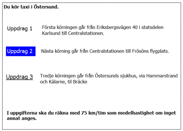 Hur lång blir kundens resa i uppdrag 1 om du kör via Övre Husargatan och Nya Allen?