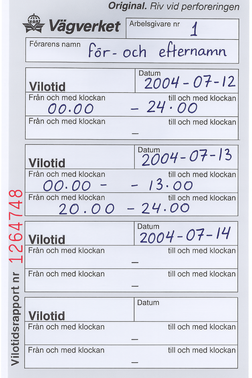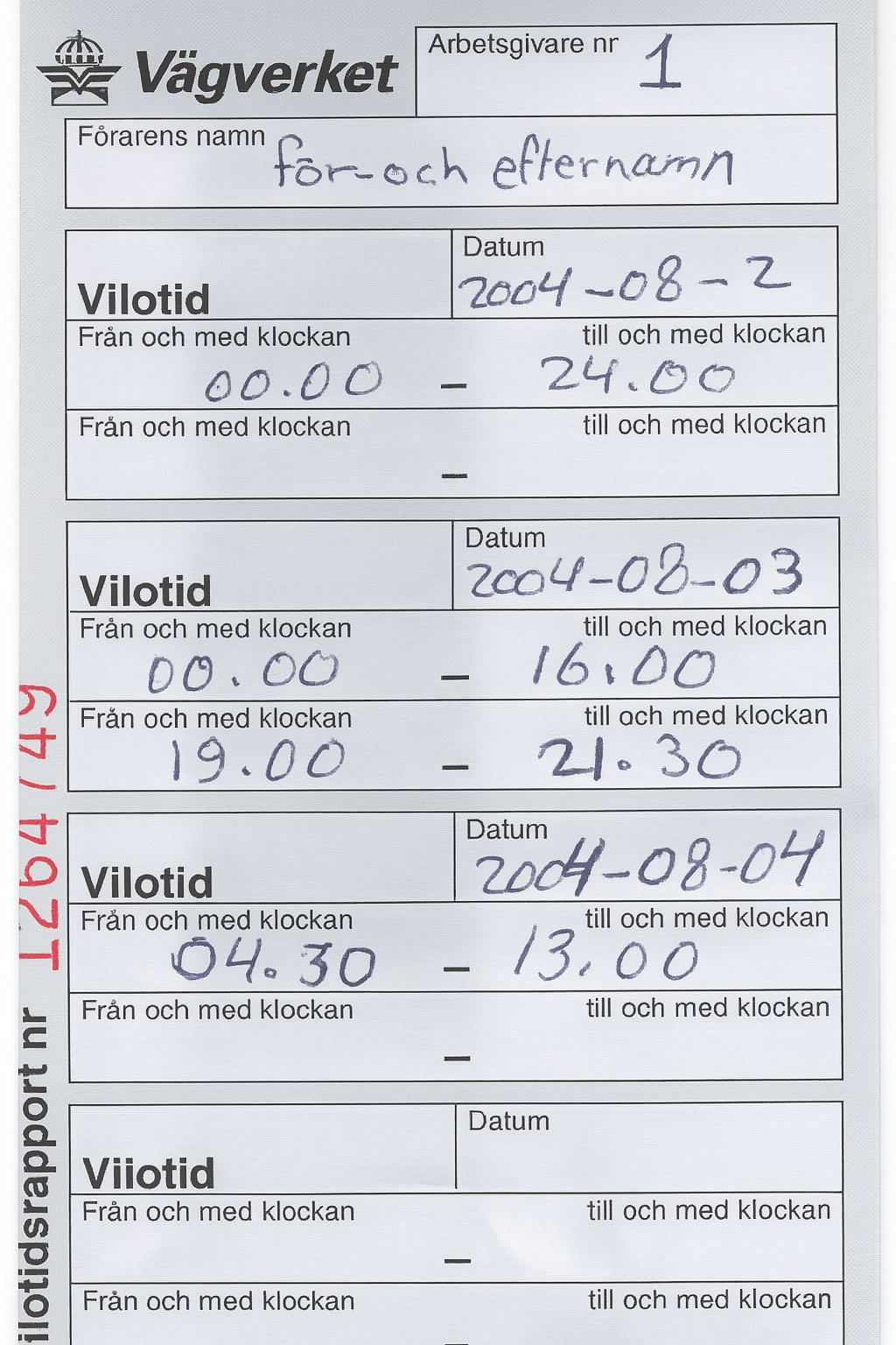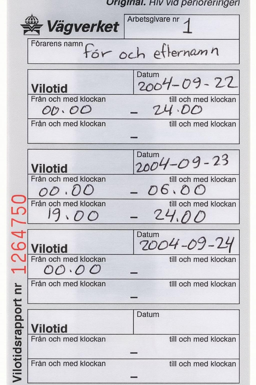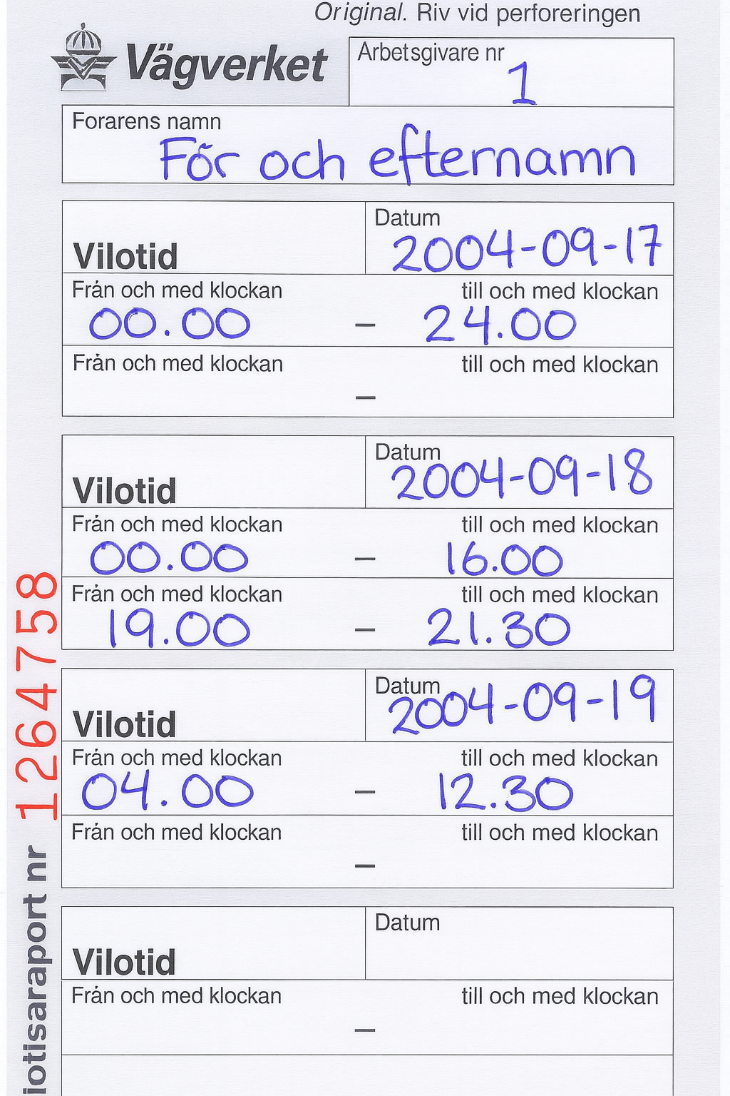 Du blir stoppad i en poliskontroll den 19 september kl 16.00 och visar detta tidboksbladet. Är uttagen vilotid tillräcklig?