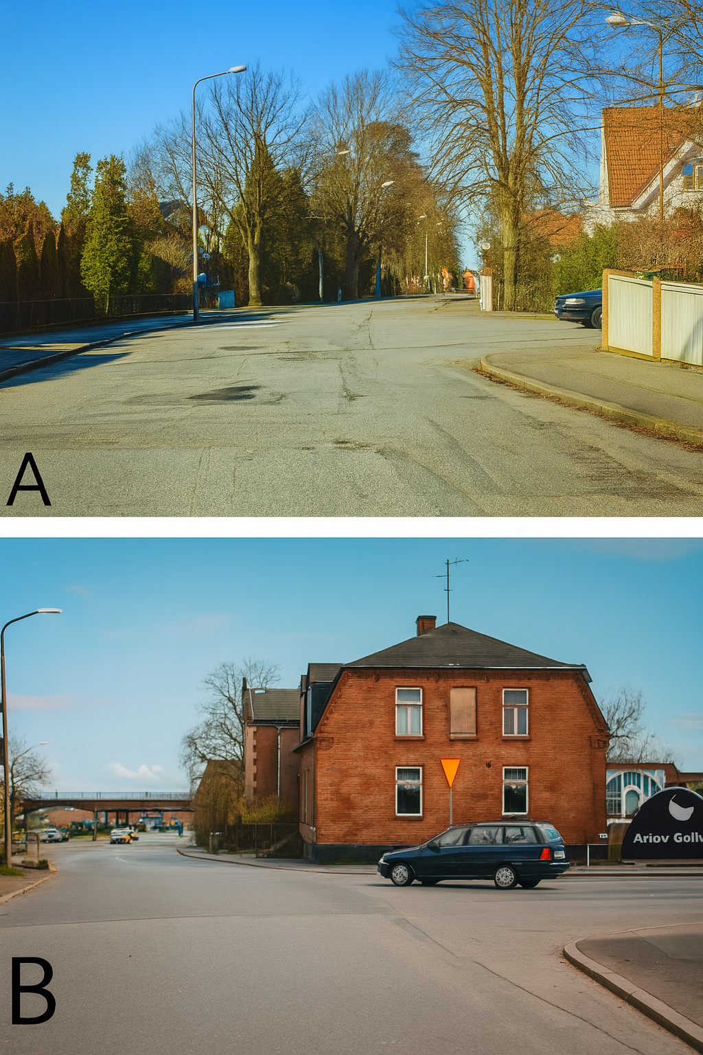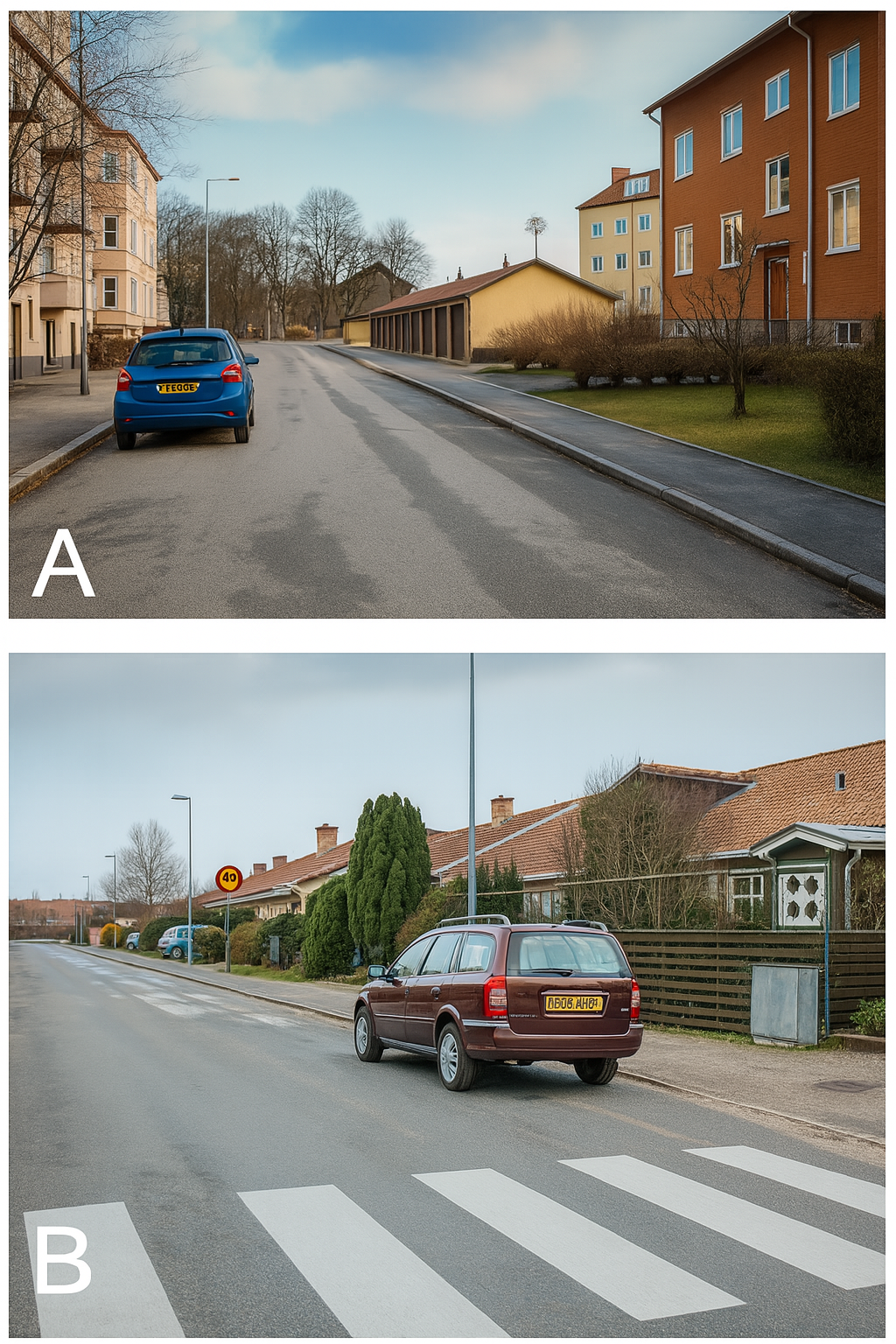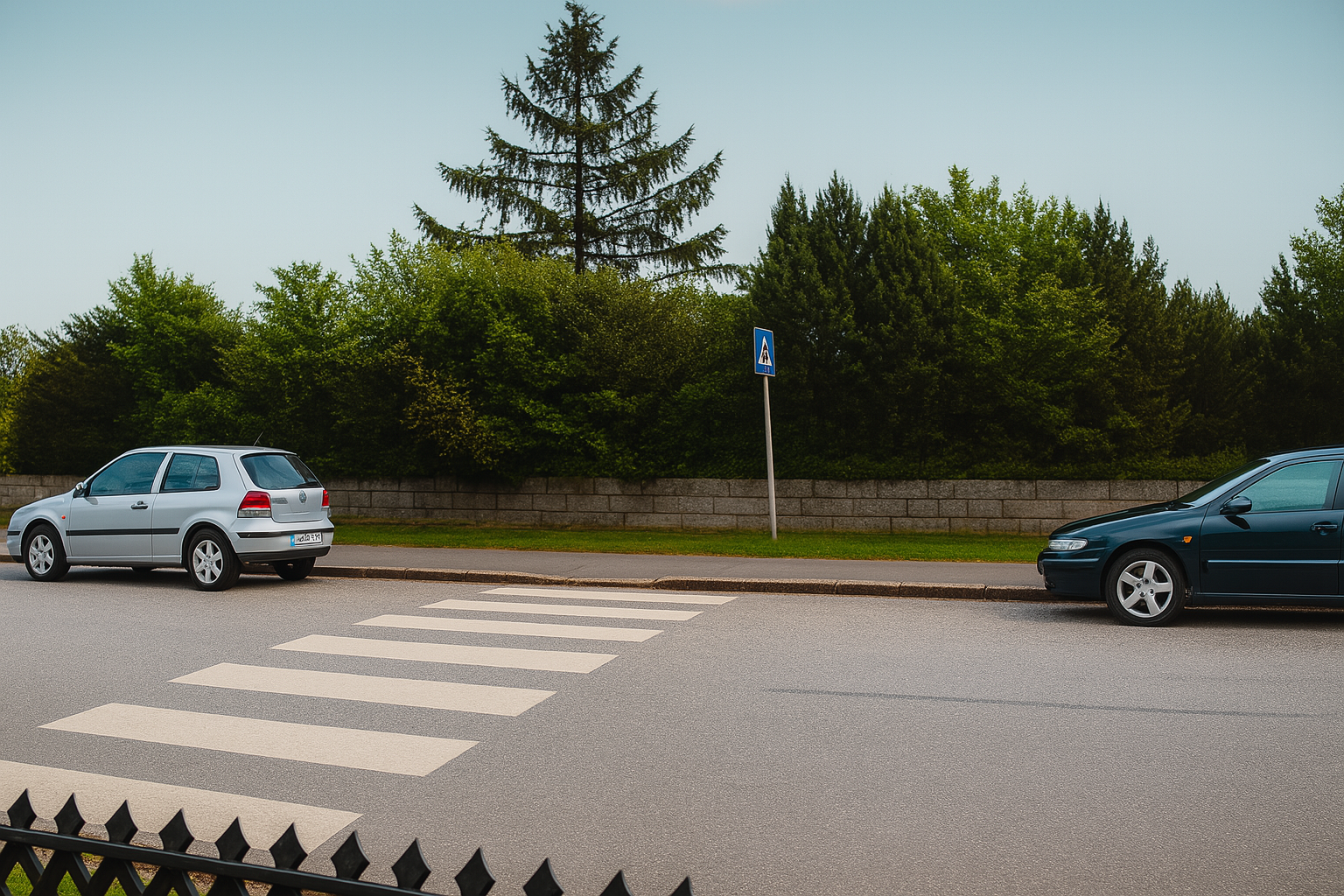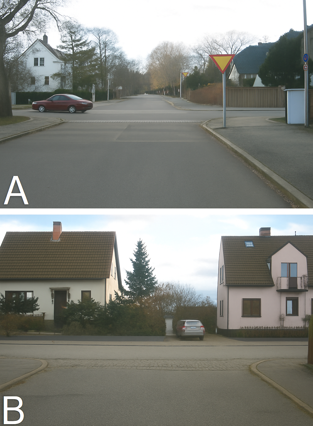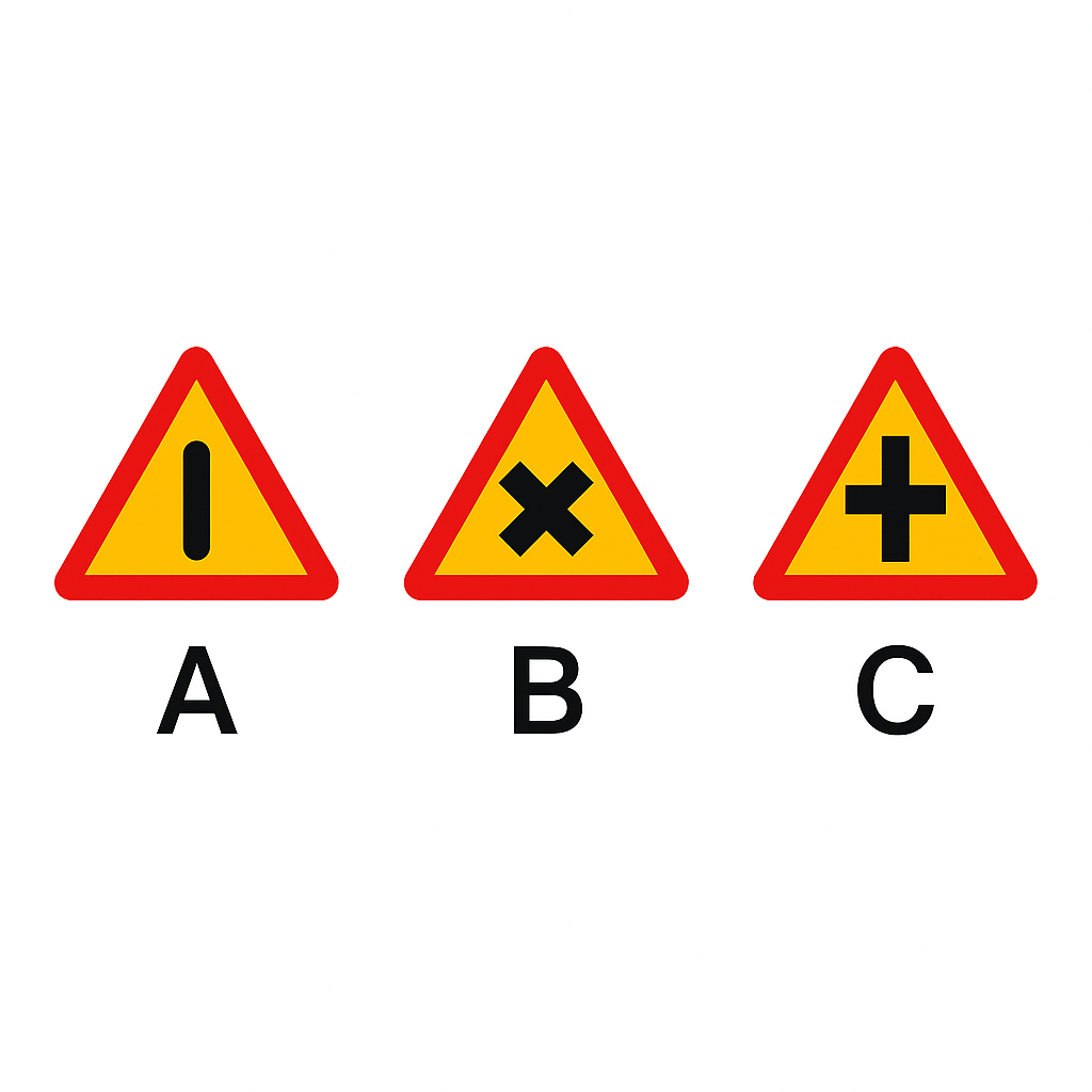 Du ska fortsätta rakt fram. Har du väjningsplikt mot bilen i någon av korsningarna?