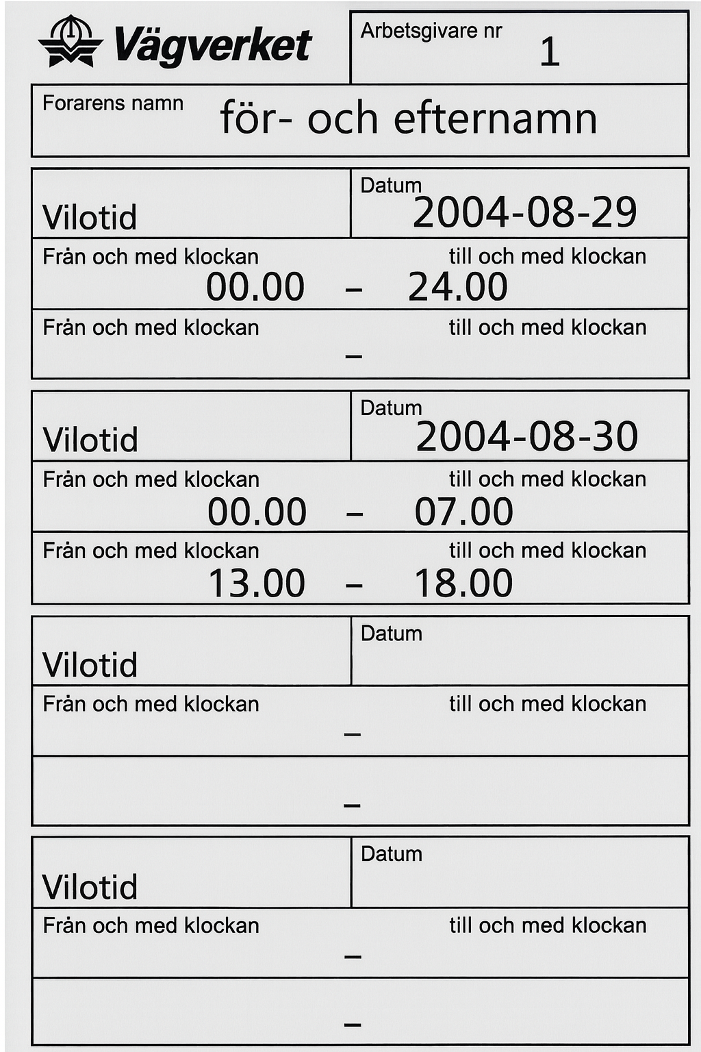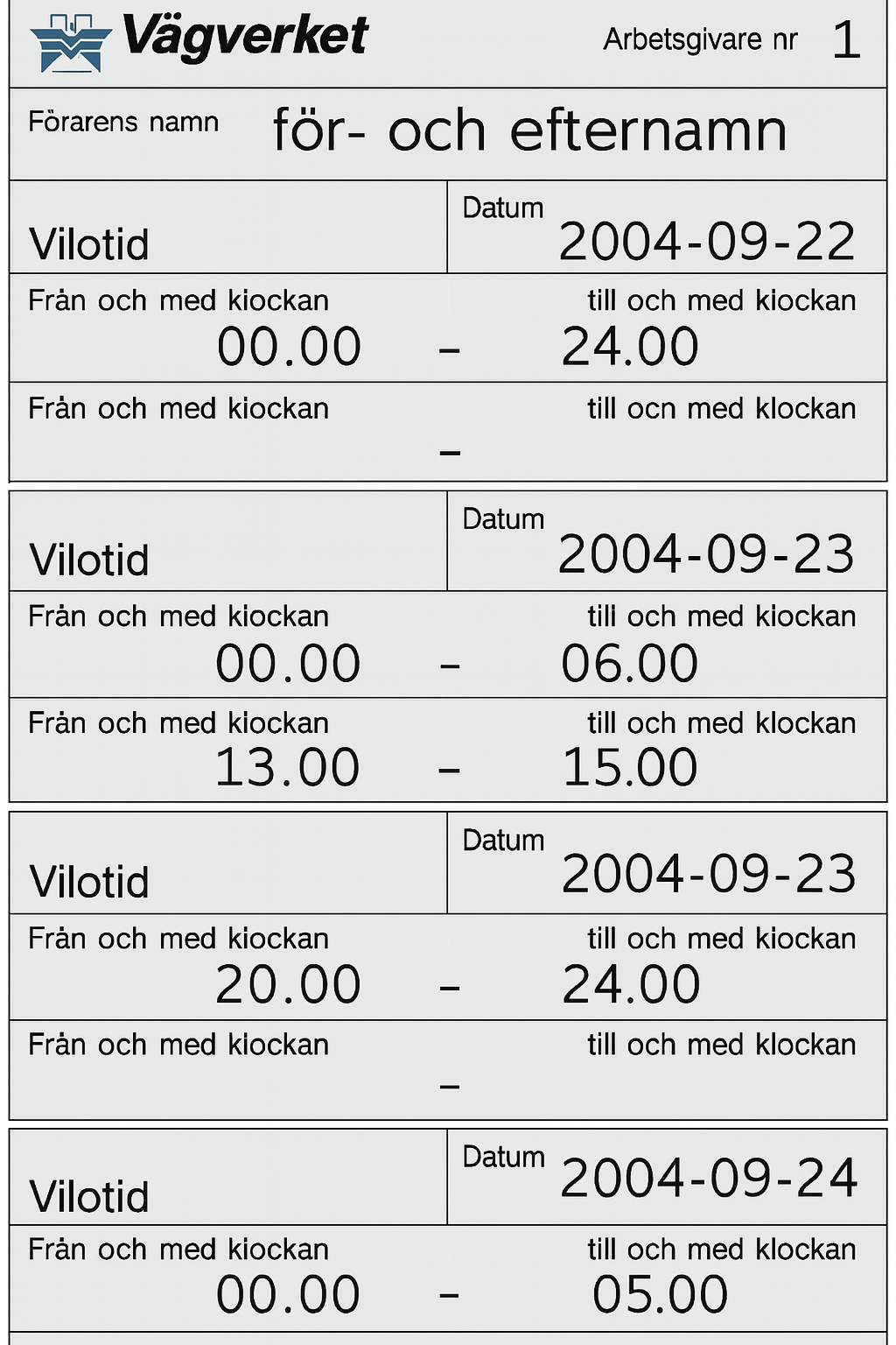 Du ska börja köra taxi igen efter två veckors ledighet. Hur ska du ange dygnsvilan i tidboken före körningen?