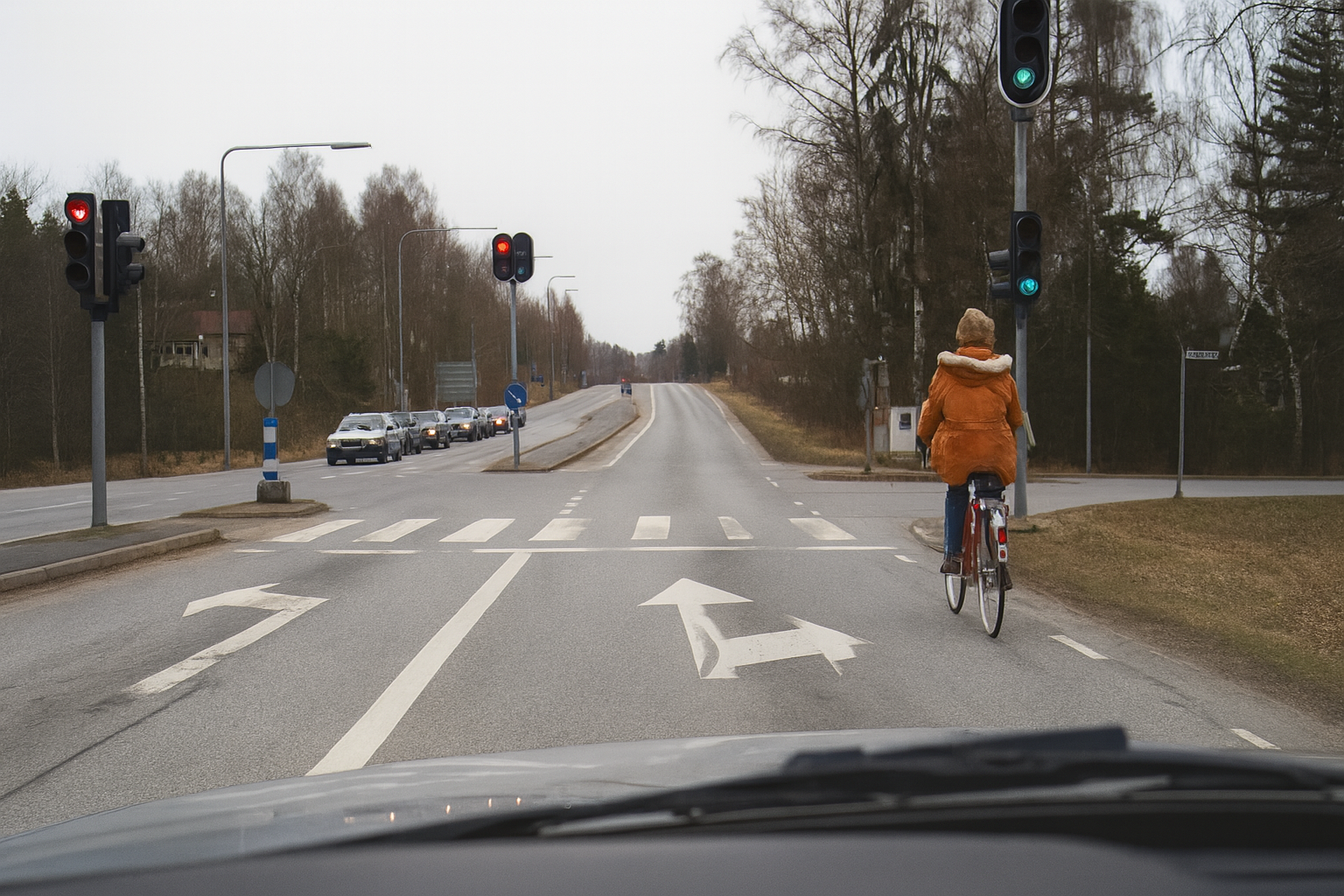 Du ska fortsätta rakt fram i korsningen. Hur kör du på säkraste sätt om cyklisten?